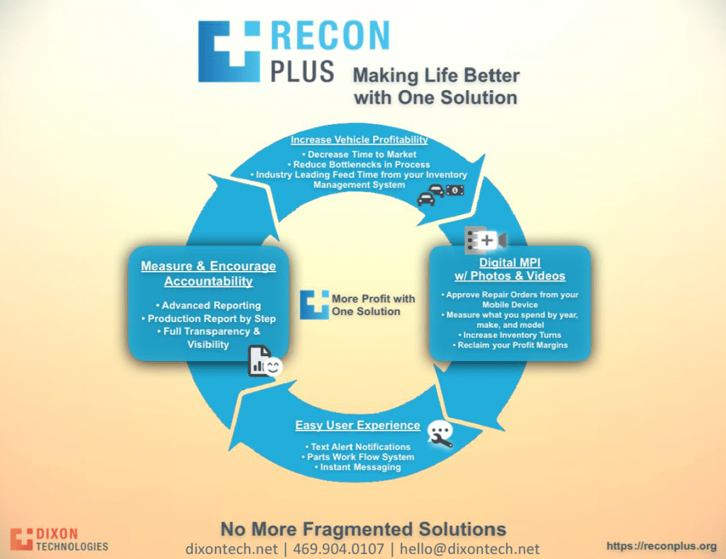 Fortunately, Recon Plus from Dixon Technologies can help you reclaim that profit margin and get rid of spreadsheets and manual repair orders. Recon Plus measures your reconditioning process every step of the way to identify bottlenecks. Recon Plus integrates directly with your DMS so there is no need for manual inputs, and you can even approve repair orders straight from your mobile device.