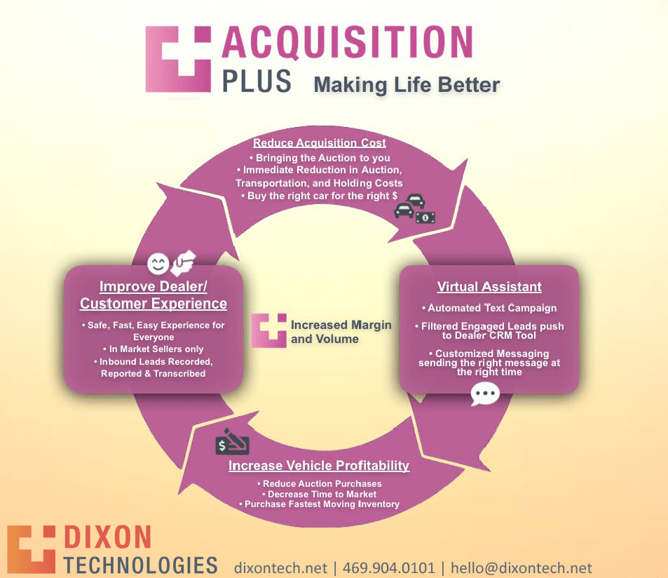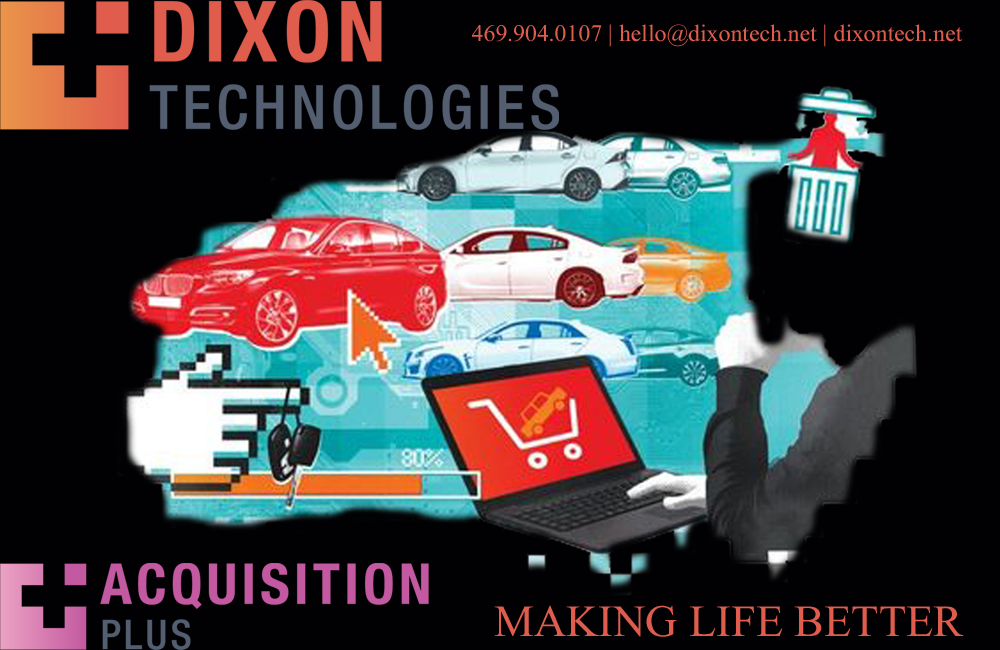 Dixon Technologies, with offices in Dallas and Houston, Texas, is “Making Life Better” for dealerships by helping them grow and retain their customer base utilizing the most advance suite of services on the market. Products such as Status Plus, Recon Plus and Acquisition Plus allow dealerships to complete the cycle to profitability in both service and sales. For more information or to request a demo visit https://dixontech.net or call 469.904.0107.