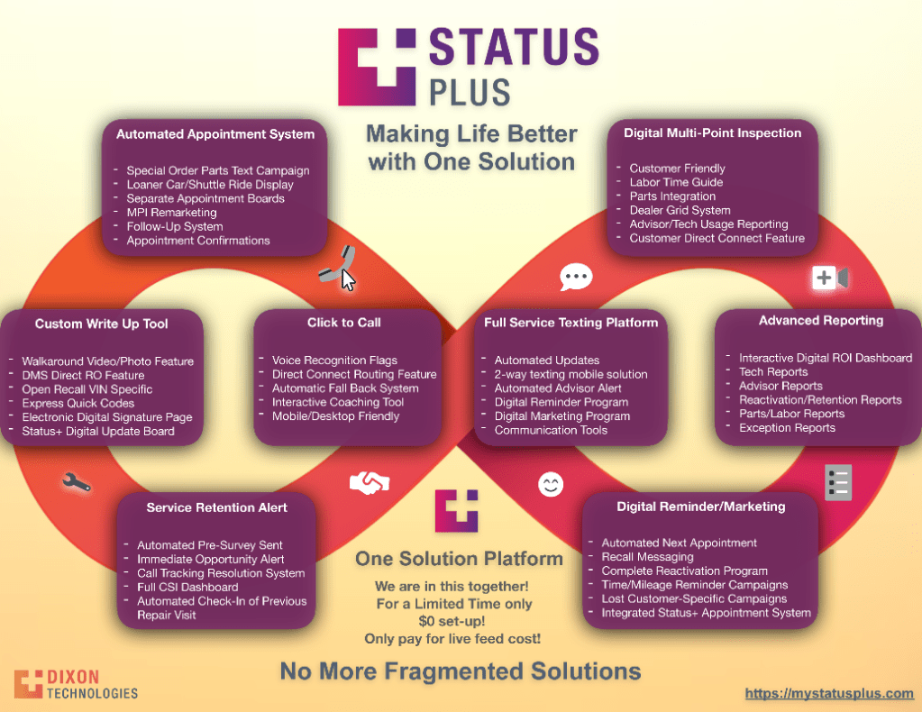 Dixon Technologies, the leader in helping dealers grow and retain their customer base through an advance suite of services has introduced the most innovative product on the market called Status Plus helping dealerships complete the service cycle from start to finish and guiding the customer into positively reviewing the dealerships great customer service.